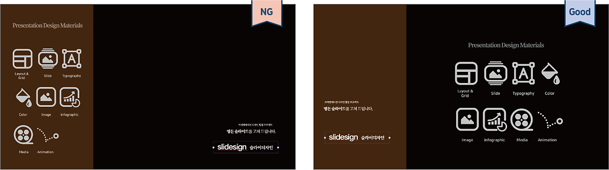 마찬가지로 프레젠테이션 디자인에서 텍스트나 이미지 등의 요소를 배치할 때 삼등분의 법칙을 참고하여 레이아웃하면 중요한 내용은 더욱 부각할 수 있고, 전체적으로 균형감이 느껴지는 안정적인 슬라이드를 디자인할 수 있습니다.