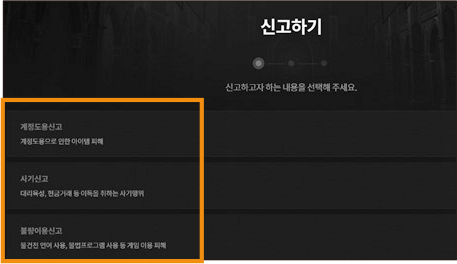 게임에 대한 모든 정보를 가지고 있고, 실제 해커가 이용해서 접속한 경로와 한 행위에 대한 기록을 가지고 있는 것이 게임 회사이므로 실제 침해사고 여부 및 해킹 여부를 판단할 수 있는 것도 게임 회사입니다. 회사마다 다르겠지만, 고객 지원 → 게임 선택 → 신고하기 → 사고 유형 선택 → 서버, 캐릭터, 시간, 아이템 등의 상세 내용을 작성하여 제출하는 방식을 통해서 침해 내용을 신고할 수 있습니다. 금전적인 아이템이 도난당한 것이 확인되면 사이버 수사대 등 수사기관에 문의해서 추가적인 확인 및 대응도 할 수 있습니다.