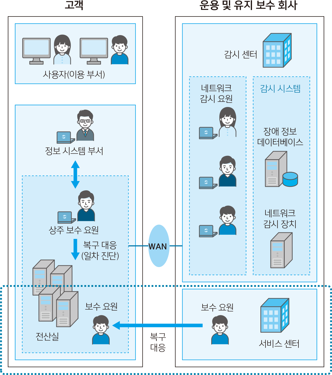 신고를 받은 운용 및 유지 보수 회사는 장애 상황에 대해 기술적인 측면에서 고객에게 문진해 원인을 분석한 후 복구 작업을 합니다.