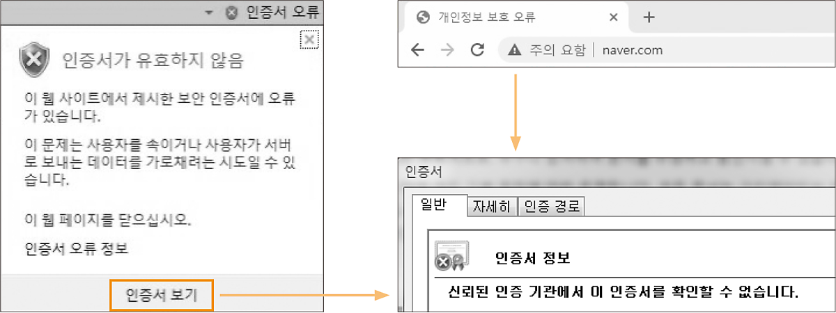 주소창의 붉은색 배경이나 ‘주의 요함’ 표시와 같이 최소한의 표시를 보여줍니다. 그러한 표시를 놓치면 안 됩니다. 인증서 보기와 같이 상세보기를 누르면 신뢰할 수 없다는 메시지를 같이 볼 수 있습니다.